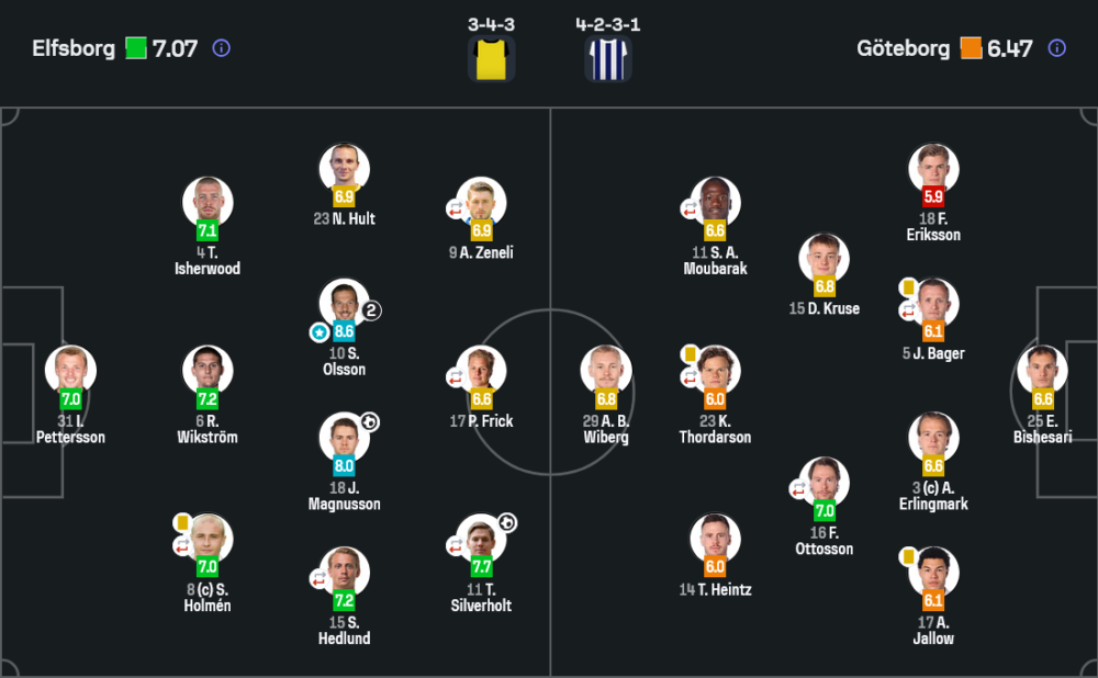 ไซมอน โอลส์สัน คว้ารางวัลผู้เล่นยอดเยี่ยมของเกมด้วยคะแนน 8.6 และถือว่าสมเหตุสมผลทุกอย่าง เขาคือคนที่คุมจังหวะแดนกลางของเอล์ฟส์บอร์กได้อยู่หมัด ทั้งการต่อบอล การเปลี่ยนเกมจากรับเป็นรุก และการสร้างแรงกดดันใส่แนวรับโกเตบอร์ก ยิ่งเกมเปิดในครึ่งหลัง เขายิ่งเด่นและมีอิทธิพลกับสองประตูของทีมแบบชัดเจน