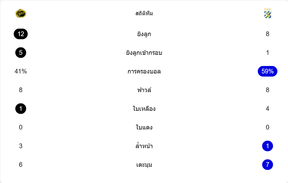 เกมนี้เอล์ฟส์บอร์กยิง 12 ครั้ง เข้ากรอบ 5 ครั้ง ขณะที่โกเตบอร์กยิง 8 ครั้ง ตรงกรอบแค่ 1 หน แม้ทีมเยือนจะครองบอลมากกว่าที่ 59 เปอร์เซ็นต์ แต่ความอันตรายในพื้นที่สุดท้ายยังเป็นรองเจ้าถิ่นชัดเจน ทั้งสองทีมฟาวล์เท่ากัน 8 ครั้ง ทว่าโกเตบอร์กโดนใบเหลืองถึง 4 ใบ ส่วนเอล์ฟส์บอร์กโดน 1 ใบ ด้านเตะมุมทีมเยือนได้ 7 ครั้ง ส่วนเจ้าบ้านได้ 6 ครั้ง แต่ฝั่งที่ใช้โอกาสคุ้มกว่าคือเอล์ฟส์บอร์กแบบไม่ต้องเถียง