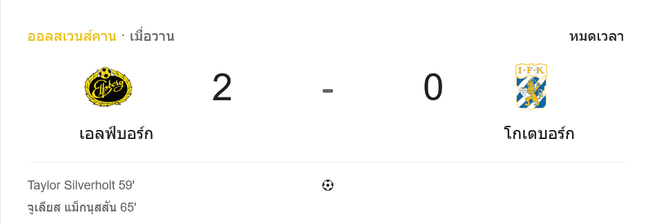 - ⚽ นาที 65 ยูลิอุส มักนุสสัน โหม่งให้เอล์ฟส์บอร์กหนี 2-0