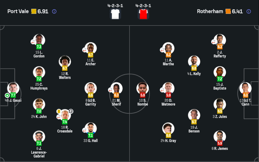 - เปลี่ยนตัว : อังเดร เกรย์ 6.2, เบน เวน 6.9, เจย์เดน สต็อคลีย์ 6.9, คอนเนอร์ ฮอลล์ 6.7, เอลิยาห์ แคมป์เบลล์ 6.8, จอร์แดน ชิปลีย์, เบน อามอส