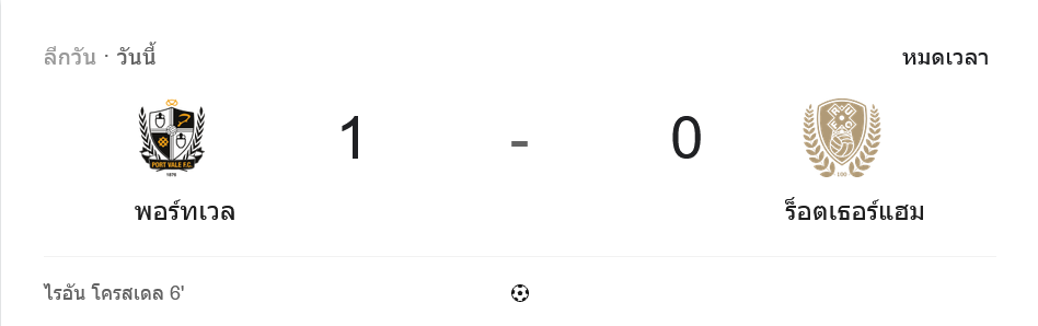 บ้านผลบอล ศึก ลีก วัน อังกฤษ คู่นี้จบลงแบบเข้มข้น พอร์ท เวล เปิดบ้านเฉือน ร็อตเธอร์แฮม ยูไนเต็ด 1-0 จากประตูชัยของ ไรอัน โครสเดล นาที 6 เก็บสามแต้มสำคัญแบบสะใจ แม้รูปเกมจะโดนทีมเยือนกดดันหนัก โดยเฉพาะครึ่งหลัง แต่เจ้าถิ่นยังยืนระยะได้เพราะความเหนียวของ โจ เกาชี ที่โชว์เซฟหลายจังหวะจนพาทีมปิดเกมแบบคลีนชีต