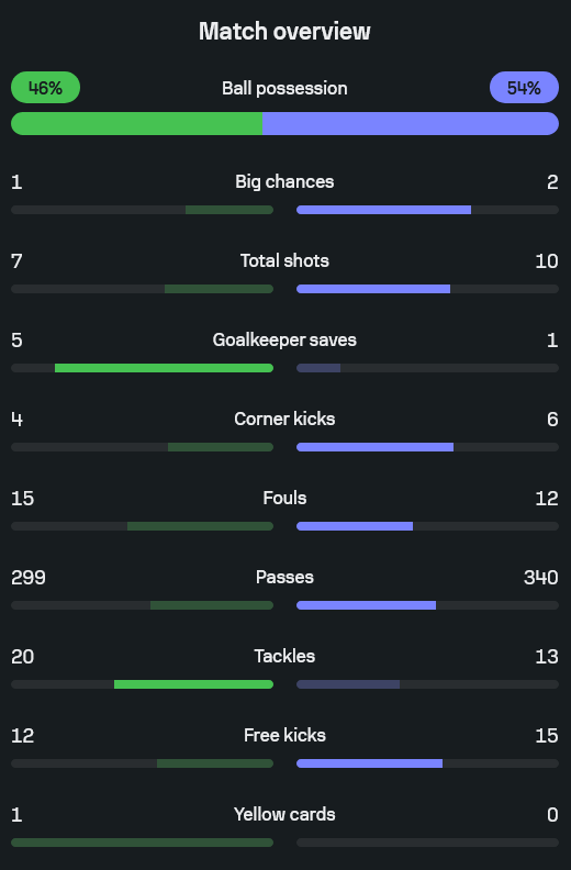 รูปเกมโดยรวม ร็อตเธอร์แฮมครองบอลมากกว่าที่ 54 เปอร์เซ็นต์ ต่อ 46 เปอร์เซ็นต์ และยิงมากกว่า 10 ครั้ง ต่อ 7 ครั้ง รวมถึงมีโอกาสสำคัญ 2 ต่อ 1 และได้เตะมุม 6 ครั้ง ขณะที่พอร์ท เวลได้ 4 ครั้ง แต่จุดตัดสินเกมจริง ๆ คือจำนวนเซฟของผู้รักษาประตู เจ้าถิ่นเซฟถึง 5 ครั้ง ส่วนทีมเยือนเซฟเพียง 1 ครั้ง สะท้อนว่าพอร์ท เวลอาจบุกน้อยกว่า แต่เกมรับและผู้รักษาประตูคือคำตอบของชัยชนะนัดนี้