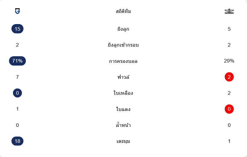 ถ้ามองจากตัวเลข บ้านผลบอล นัดนี้ กัมบะเหนือกว่าชัดเจนในเรื่องปริมาณ พวกเขาครองบอล 71 เปอร์เซ็นต์ ยิง 15 ครั้ง เข้ากรอบ 2 ครั้ง และได้เตะมุมถึง 18 ครั้ง ขณะที่ ทรู แบงค็อก ยูไนเต็ด ครองบอลเพียง 29 เปอร์เซ็นต์ ยิง 5 ครั้ง เข้ากรอบ 2 ครั้ง และได้เตะมุมแค่ 1 หน แต่สิ่งที่ต่างกันคือคุณภาพในจังหวะตัดสิน แบงค็อกใช้โอกาสได้เฉียบกว่า ส่วนกัมบะบุกเยอะแต่ปิดงานไม่ลง