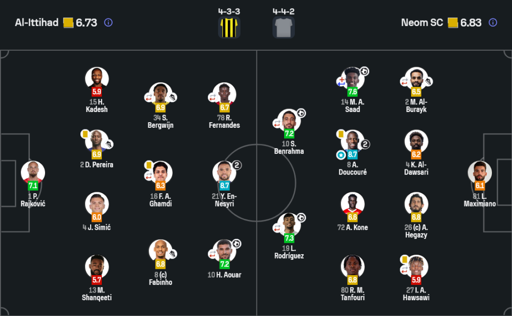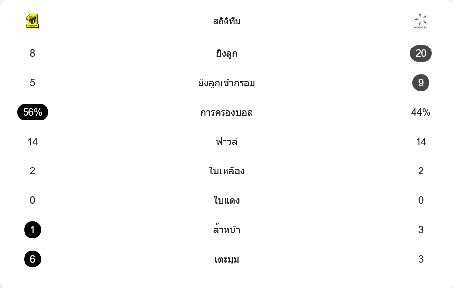 แม้อัล อิตติฮัดจะครองบอลมากกว่าที่ 56 เปอร์เซ็นต์ และได้เตะมุม 6 ครั้ง แต่นีออมคือทีมที่สร้างอันตรายได้หนักกว่าอย่างชัดเจน จากโอกาสยิง 20 ครั้ง เข้ากรอบ 9 ครั้ง ขณะที่เจ้าถิ่นยิง 8 ครั้ง เข้ากรอบ 5 ครั้ง ทั้งสองทีมฟาวล์เท่ากัน 14 ครั้ง และรับใบเหลืองฝั่งละ 2 ใบ ไม่มีใบแดง ตัวเลขทั้งหมดสะท้อนว่าอัล อิตติฮัดมีบอลมากกว่า แต่ความคมและความเด็ดขาดเป็นของนีออม