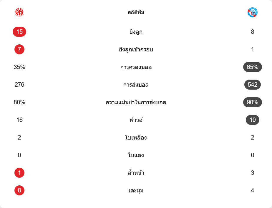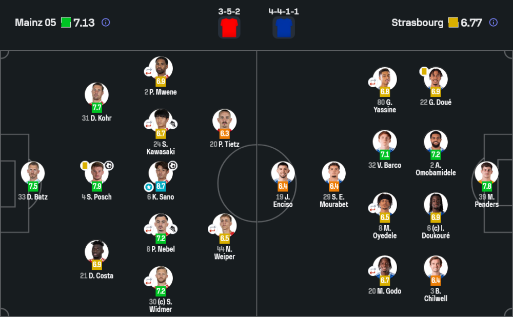 แม้สตราส์บูร์กจะครองบอลมากถึง 65 เปอร์เซ็นต์ ผ่านบอล 542 ครั้ง และแม่นยำ 90 เปอร์เซ็นต์ แต่ไมนซ์อันตรายกว่าชัดเจนจากการยิง 15 ครั้ง เข้ากรอบ 7 ครั้ง ขณะที่ทีมเยือนยิง 8 ครั้ง เข้ากรอบแค่ 1 หน ไมนซ์ยังได้เตะมุมมากกว่า 8 ต่อ 4 และเล่นเกมรุกได้ตรงจุดกว่า จึงไม่แปลกที่พวกเขาจะเป็นฝ่ายคว้าชัยแบบน่าเชื่อถือ
