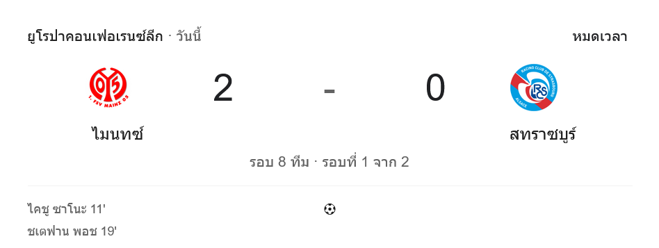บ้านกีฬา สรุปเกม ผลบอลสด ยูโรปา คอนเฟอเรนซ์ ลีก รอบ 8 ทีมสุดท้าย นัดแรก ที่ไมนซ์เปิดบ้านอัดสตราส์บูร์ก 2-0 แบบคมกริบและชัดเจนกว่าในทุกจังหวะสำคัญ สองประตูเร็วจาก ไคชู ซาโนะ และ สเตฟาน พอช ทำให้เจ้าถิ่นกุมเกมไว้ตั้งแต่ครึ่งแรก ก่อนปิดงานอย่างนิ่งในครึ่งหลัง