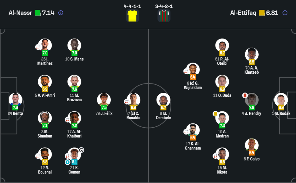 เจ้าถิ่นเป็นฝ่ายครองจังหวะได้ดีกว่า บุกมากกว่า และมีโอกาสจบสกอร์ต่อเนื่อง โดยเฉพาะแนวรุกอย่าง โรนัลโด้, มาเน่ และ โกม็อง ที่ปั่นป่วนแนวรับทีมเยือนได้ตลอด ส่วน อัล-เอตติฟาค มีจังหวะสวนกลับน่ากลัวหลายครั้ง แต่สุดท้ายเปลี่ยนเป็นประตูไม่ได้