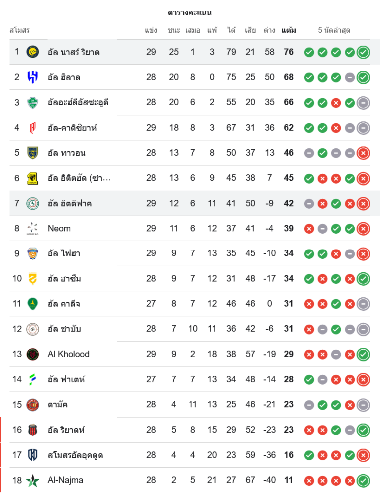 สถานการณ์ในตารางคะแนนซาอุดิ โปร ลีก