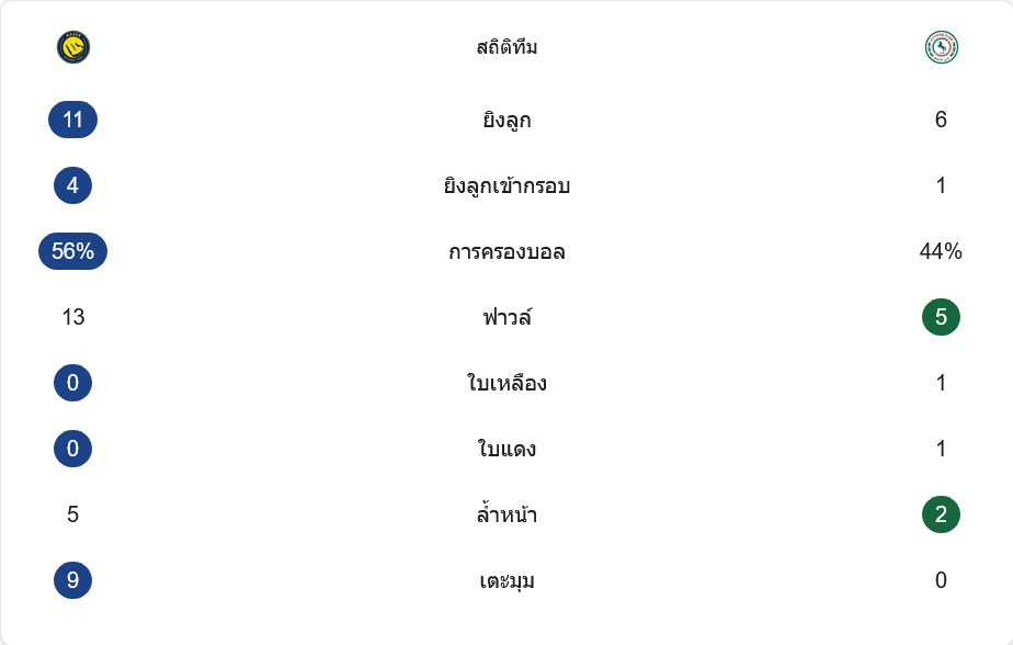 เกมนี้ อัล นาสเซอร์ เหนือกว่าชัดเจนจากการยิง 11 ครั้ง เข้ากรอบ 4 ครั้ง ขณะที่ อัล-เอตติฟาค ยิง 6 ครั้ง เข้ากรอบเพียง 1 หน เจ้าถิ่นครองบอล 56 เปอร์เซ็นต์ และทีมเยือน 44 เปอร์เซ็นต์ นอกจากนี้ อัล นาสเซอร์ ยังได้เตะมุมมากถึง 9 ครั้ง ส่วน อัล-เอตติฟาค ไม่มีเลยแม้แต่ครั้งเดียว ตัวเลขนี้สะท้อนชัดว่าทีมของเจ้าบ้านเป็นฝ่ายเดินเกมรุกมากกว่าแทบตลอดทั้งแมตช์