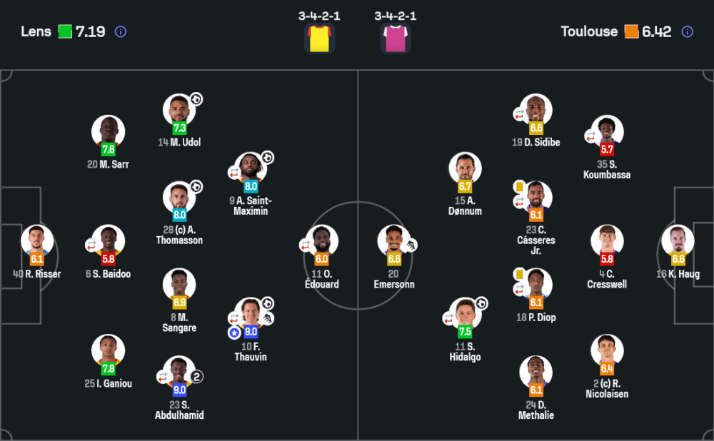 ล็องส์ยืนระบบ 3-4-2-1 และเล่นได้แน่นกว่าชัดเจน จุดเด่นคือการขึ้นเกมจากด้านข้างและการประสานงานของ ฟลอริย็อง เธอแว็ง กับ อัลล็อง แซงต์ มักซิแม็ง ที่คอยโจมตีพื้นที่ระหว่างแนวรับตูลูสได้ตลอด ทำให้เกมรุกของเจ้าถิ่นทั้งเร็วและอันตราย โดยเฉพาะฝั่งขวาที่ ซาอุด อับดุลฮามิด เติมขึ้นมาได้มีคุณภาพมากจนทำ 2 แอสซิสต์