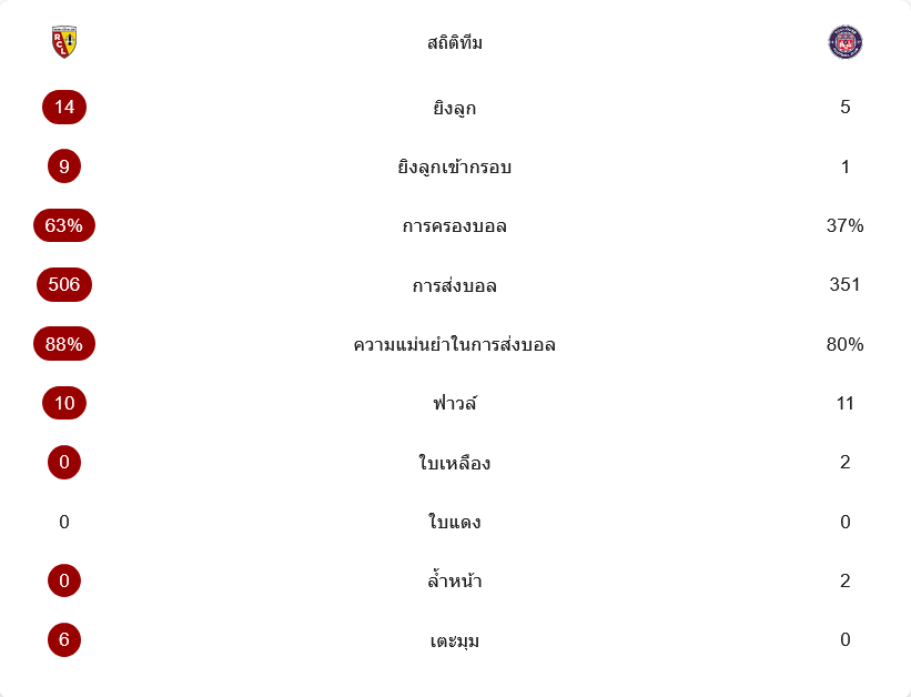 เกมนี้ล็องส์เหนือกว่าทั้งการครองบอลและความแม่นยำ พวกเขายิง 14 ครั้ง เข้ากรอบ 9 ครั้ง ขณะที่ตูลูสยิง 5 ครั้ง เข้ากรอบแค่ 1 ครั้ง เจ้าถิ่นครองบอล 63 เปอร์เซ็นต์ จ่ายบอล 506 ครั้ง ความแม่นยำ 88 เปอร์เซ็นต์ ส่วนตูลูสครองบอล 37 เปอร์เซ็นต์ จ่าย 351 ครั้ง ความแม่นยำ 80 เปอร์เซ็นต์ อีกจุดที่ต่างชัดคือ ล็องส์ได้เตะมุม 6 ครั้ง แต่ตูลูสไม่มีเลย สะท้อนว่าทีมเยือนแทบถูกกดอยู่ฝั่งตัวเองตลอดเกม