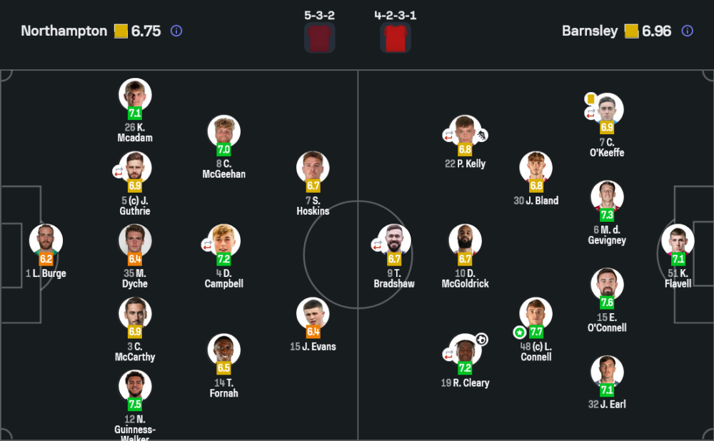 Player of the match คือ ลูก้า คอนเนลล์ มิดฟิลด์บาร์นสลี่ย์ คะแนน 7.7 เขาคุมแดนกลางได้แน่น ตัดเกมดี และช่วยให้ทีมเยือนยืนระยะได้ตลอดช่วงที่นอร์ทแฮมป์ตันเร่งบุกหนัก ผลงานนิ่ง ๆ แต่ทรงพลังแบบนี้คือหัวใจของชัยชนะนัดนี้
