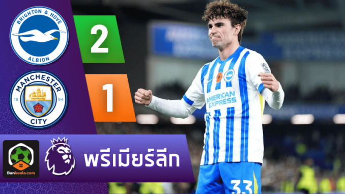 ผลบอลสด จากการพบกันในศึก พรีเมียร์ลีก นัดล่าสุด ไบรท์ตัน โฮฟ อัลเบี้ยน โชว์ฟอร์มสุดเข้มข้น เปิดบ้านเอาชนะ แมนเชสเตอร์ ซิตี้ ได้อย่างสมศักดิ์ศรี ด้วยสกอร์ 2-1 ทั้งนี้ ไบรท์ตัน โชว์เกมรุกและป้องกันได้ดี ตลอดจนความเด็ดขาดในช่วงท้ายเกมทำให้พวกเขาเก็บสามแต้มสำคัญได้สำเร็จ