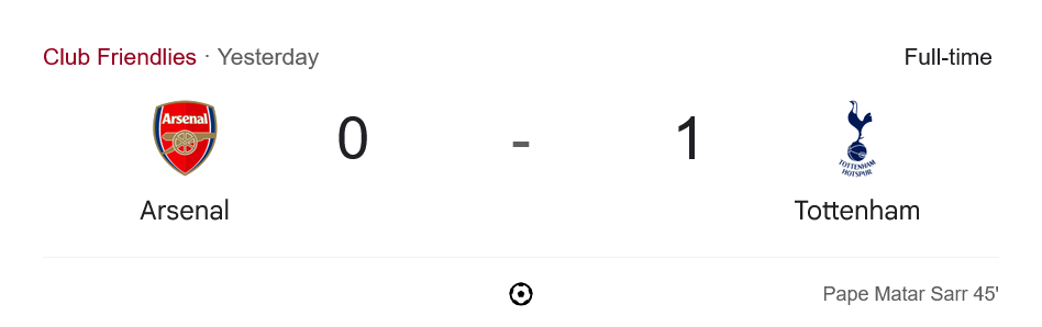 ลอนดอนดาร์บี้แมตช์แม้เป็นเกมกระชับมิตร แต่ความดุเดือดไม่ลดลงแม้แต่น้อย เมื่อท็อตแน่ม ฮ็อทสเปอร์ บุกเอาชนะอาร์เซนอลได้ถึงถิ่นเอมิเรตส์ สเตเดี้ยมด้วยสกอร์ 1-0 จากประตูโทนของ พาเป้ มาตาร์ ซาร์ ปิดฉากเกมที่อัดแน่นด้วยแท็กติก ดุเดือดด้วยการปะทะ และเต็มไปด้วยจังหวะบีบหัวใจตามแบบฉบับ ผลบอลสด ระดับบิ๊กแมตช์ที่แท้จริง