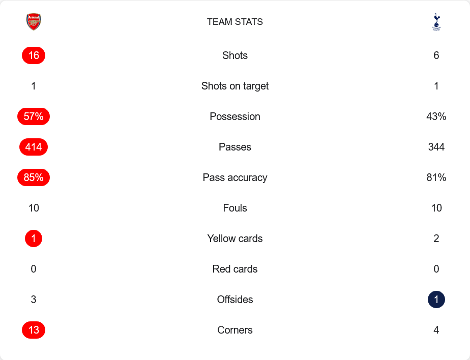 อาร์เซนอลเป็นฝ่ายครองเกมเหนือกว่าอย่างชัดเจนด้วยการครองบอล 57% และมีโอกาสยิงมากถึง 16 ครั้ง ทว่ากลับยิงเข้ากรอบเพียงลูกเดียวเท่านั้น ขณะที่สเปอร์สได้โอกาสยิง 6 ครั้งและเข้ากรอบเท่ากัน 1 ครั้ง แต่กลับเปลี่ยนเป็นประตูชัยได้สำเร็จในจังหวะเดียว อาร์เซนอลจ่ายบอลทั้งหมด 414 ครั้งแม่นยำถึง 85% ส่วนสเปอร์สจ่าย 344 ครั้งแม่นยำ 81% ทั้งสองทีมฟาวล์เท่ากันที่ 10 ครั้ง แต่สเปอร์สโดนใบเหลืองมากกว่า (2 ใบ) ขณะที่ปืนใหญ่มีแค่ 1 ใบ สถิติเตะมุมยังบ่งชี้ว่าอาร์เซนอลกดดันหนักกว่า โดยได้ถึง 13 ครั้ง เทียบกับ 4 ครั้งของทีมเยือน