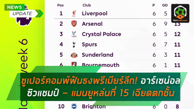 หลังผ่านการแข่งขันไปเพียง 6 นัดในฤดูกาลใหม่ พรีเมียร์ลีก 2025/26 สถานการณ์เริ่มเข้มข้น โดยในเวลานี้ ลิเวอร์พูล ยึดจ่าฝูงด้วย 15 คะแนน ขณะที่ อาร์เซน่อล ไล่ตามมาอย่างกระชั้นชิดด้วยคะแนนห่างเพียง 2 แต้ม และมีฟอร์มที่ดูมั่นคงและสม่ำเสมอมากขึ้นเรื่อย ๆ