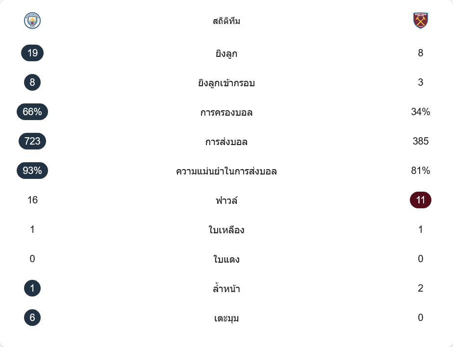 แม้ฟาวล์ของซิตี้จะมากกว่า 16 ต่อ 11 แต่ก็เป็นการตัดเกมแบบมีวินัย ไม่ถึงขั้นรุนแรง ทำให้มีแค่ใบเหลืองฝั่งละหนึ่งใบ และไม่มีใบแดงเกิดขึ้นตลอด 90 นาที ที่น่าสนใจคือ ซิตี้ได้เตะมุมถึง 6 ครั้ง ขณะที่เวสต์แฮมไม่มีเตะมุมเลย แสดงให้เห็นว่าทีมเยือนแทบไม่สามารถกดดันแนวรับเรือใบให้ต้องเคลียร์บอลออกหลังได้เลย