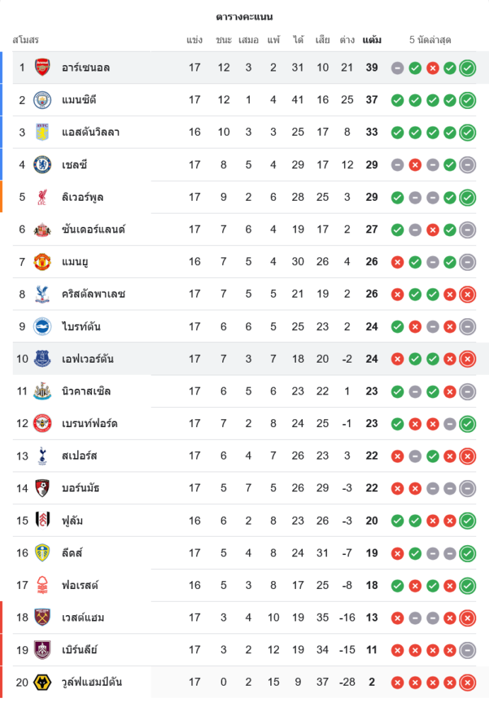 ส่วนเอฟเวอร์ตันแม้จะพ่ายคาบ้านแต่ยังยึดอันดับ 10 มี 24 แต้มจาก 17 นัด ผิดหวังกับผลการแข่งขันแต่ยังไม่ถึงขั้นต้องหนีตกชั้น ทว่าหากอยากลุ้นพื้นที่ยุโรปก็ต้องเร่งฟอร์ม เพราะระยะห่างจากโซนหัวตารางยังมีช่องว่างพอสมควร และการแพ้ในบ้านแบบแทบไม่มีจังหวะยิงตรงกรอบเช่นนี้คือสัญญาณเตือนว่าต้องปรับจูนเกมรุกด่วน
