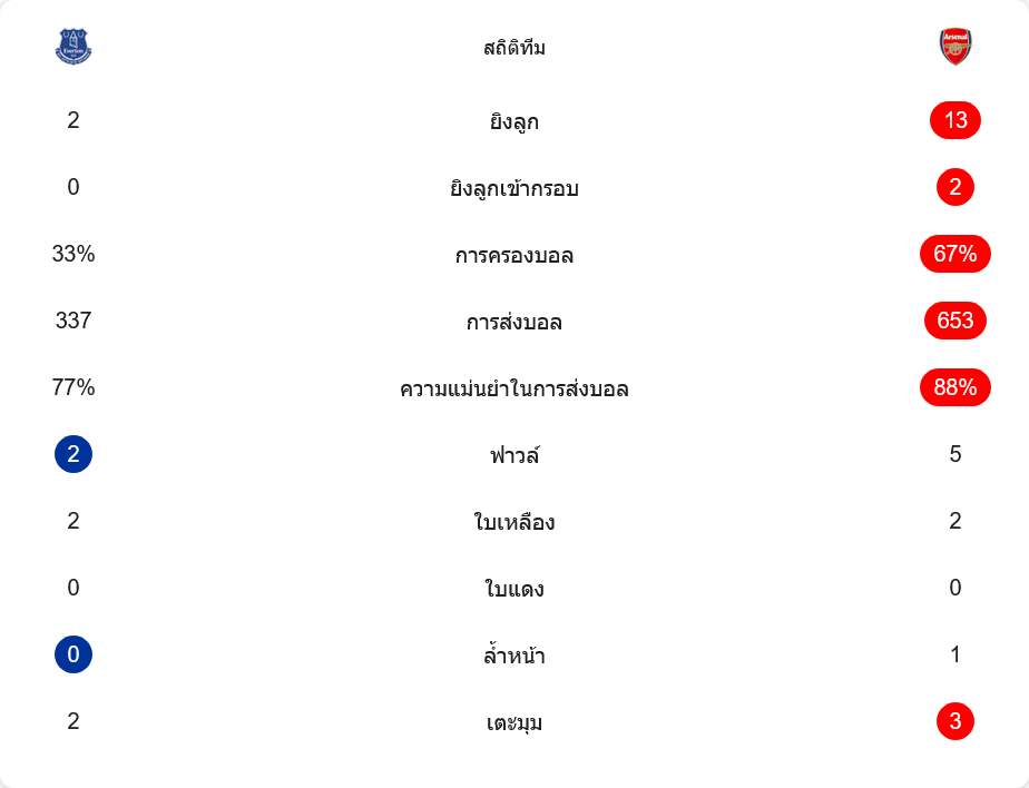 ตัวเลขหลังเกมชี้ชัดว่าอาร์เซนอลเหนือกว่าอย่างสิ้นเชิง ทีมเยือนสร้างโอกาสยิงได้ถึง 13 ครั้ง เข้ากรอบ 2 ครั้ง ขณะที่เอฟเวอร์ตันมีโอกาสยิงเพียง 2 หนและไม่มีลูกไหนตรงกรอบเลย การครองบอลก็เป็นฝ่ายปืนใหญ่อย่างชัดเจนที่ 67% ต่อ 33% พร้อมกับจำนวนการส่งบอล 653 ครั้ง ความแม่นยำสูงถึง 88% ส่วนทอฟฟี่สีน้ำเงินส่งบอลได้ 337 ครั้ง ความแม่นยำ 77% เท่านั้น