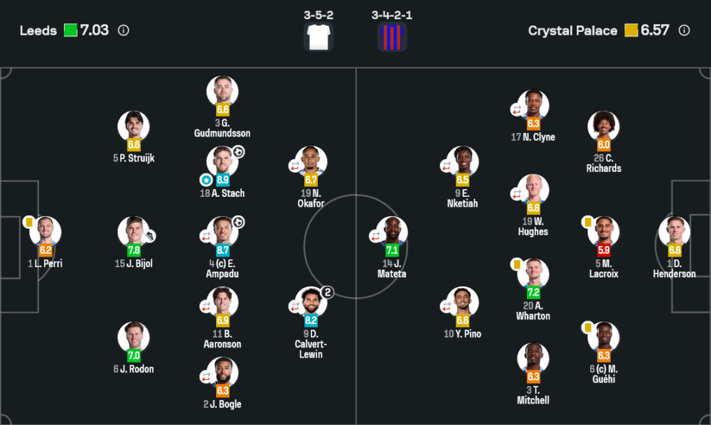 ด้าน คริสตัล พาเลซ แม้ระบบ 3-4-2-1 ของกลัสเนอร์ตั้งใจให้ใช้การเคลื่อนที่ของปีโน่กับเอ็นเคเทียห์ปั่นป่วนระหว่างกองหลังลีดส์ แต่การ build-up จากหลังขึ้นหน้าทำได้ไม่ค่อยลื่น การส่งบอลเพียง 287 ครั้ง และความกดดันจากเพรสซิ่งของเจ้าถิ่นทำให้ต้องโยนยาวหามาเตต้าบ่อยเกินจนเสียบอลง่าย เมื่อเสียแล้วการตั้งรับโต้สวนกลับก็ยังโดนเจาะตรงกลางซ้ำ ๆ