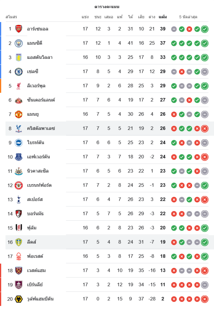 ส่วน คริสตัล พาเลซ ยังรั้งอันดับ 8 มี 26 คะแนนจาก 17 นัด โอกาสลุ้นพื้นที่ยุโรปยังเปิดอยู่เต็มที่ แต่ความพ่ายแพ้แบบโดนยิง 4 ประตูย่อมเป็นสัญญาณเตือนว่าเกมรับยังต้องปรับอีกเยอะ หากอยากขยับเข้าใกล้ท็อปโฟร์ในช่วงครึ่งฤดูกาลหลัง