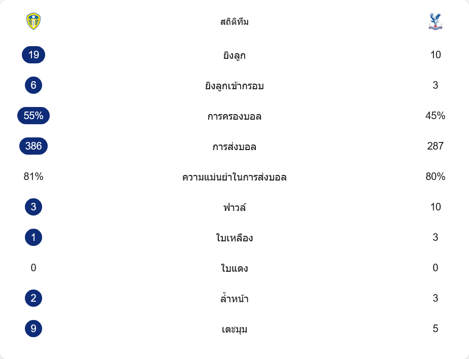 ตัวเลขหลังเกมบนหน้า บ้านผลบอล สะท้อนชัดว่าลีดส์ไม่ได้ชนะเพราะดวง เจ้าถิ่นสร้างโอกาสยิงได้ถึง 19 ครั้ง เข้ากรอบ 6 ครั้ง มากกว่าพาเลซที่ยิง 10 ครั้ง เข้ากรอบเพียง 3 ครั้ง การครองบอลแบ่ง 55% ให้ลีดส์ ต่อ 45% ของทีมเยือน แม้เปอร์เซ็นต์จะไม่ขาด แต่คุณภาพจังหวะสุดท้ายแตกต่างกันชัดเจน