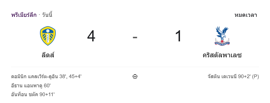 จาก : ผลบอลสด พรีเมียร์ลีก ระหว่าง ลีดส์ ยูไนเต็ด 4-1 คริสตัล พาเลซ วันนี้ 21/12/68 – บ้านกีฬา
