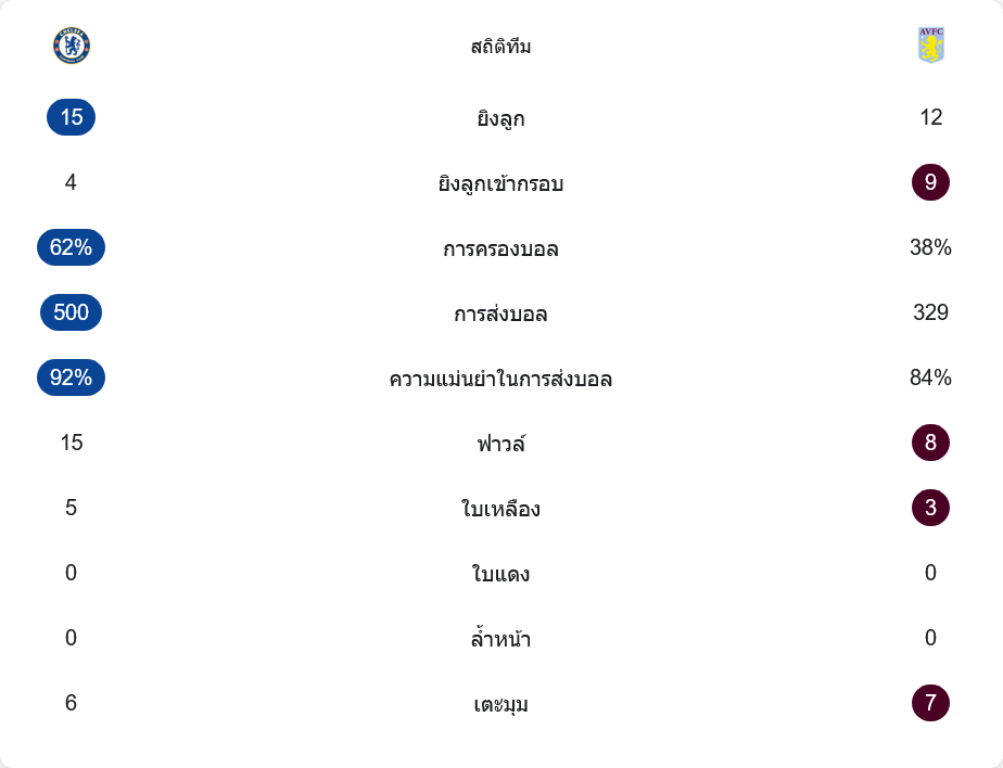 จำนวนฟาวล์ เชลซีทำไป 15 ครั้ง มากกว่าวิลล่าที่ 8 ฟาวล์ และรับใบเหลืองถึง 5 ใบ เทียบกับวิลล่า 3 ใบ ชี้ให้เห็นถึงความหัวร้อนโดยเฉพาะช่วงโดนไล่ตามและโดนแซง แม้ลูกเตะมุมเจ้าบ้านจะมากถึง 6 ครั้ง แต่ก็ไม่สามารถเปลี่ยนให้เป็นประตูเพิ่มได้ ขณะที่วิลล่าได้เตะมุม 7 ครั้ง และใช้ลูกเซตพีซกดดันแนวรับสิงห์อยู่ตลอด