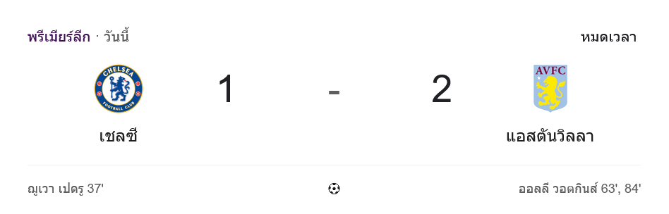 พรีเมียร์ลีก ค่ำคืนที่สแตมฟอร์ดบริดจ์กลายเป็นหนังคนละม้วน เมื่อสกอร์จากสัญญาณ ผลบอลสด บอกชัดว่า เชลซี ที่ออกนำก่อนสุดหล่อ กลับโดน แอสตัน วิลล่า บุกแซงชนะ 2-1 จากสองลูกคมกริบของตัวสำรองอย่าง โอลลี่ วัตกินส์ ทำให้บรรดาแฟนสิงห์เงียบกริบ ส่วนเหล่ากองเชียร์สิงห์ผงาดแหกปากสุดเสียงกับสามแต้มล้ำค่าที่พาทีมลุ้นแชมป์แบบเต็มปาก