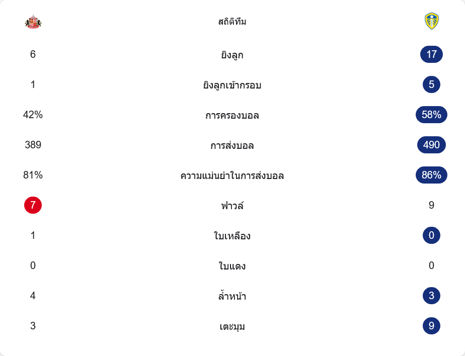 เมื่อมองตัวเลขแล้วจะเห็นว่าลีดส์บุกกดซันเดอร์แลนด์ชัดเจน ทีมเยือนมีโอกาสยิงถึง 17 ครั้ง เข้ากรอบ 5 ครั้ง ขณะที่เจ้าถิ่นมีแค่ 6 ครั้ง เข้ากรอบเพียง 1 ลูก แต่ใช้โอกาสนั้นเปลี่ยนเป็นประตูสำเร็จ การครองบอลก็เป็นของยูงทองที่ 58% ต่อ 42% ส่งบอล 490 ต่อ 389 ครั้ง และยังแม่นยำกว่า 86% ต่อ 81% สะท้อนว่าครึ่งหลังซันเดอร์แลนด์แทบไม่ได้ครองเกมเลย ต้องรับลึกแล้วหวังจังหวะสวนกลับเป็นหลัก