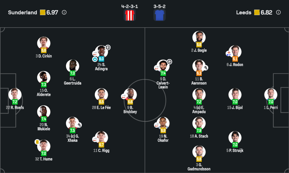 ซิมง อดิงกร้า ปีกความเร็วจัดของซันเดอร์แลนด์ ถูกยกให้เป็น Player of the Match ด้วยคะแนนสูงสุด 8.0 จากฟอร์มที่เล่นงานแนวรับลีดส์จนปั่นป่วนตั้งแต่ต้นเกม จังหวะกระชากลากเลื้อยหนึ่งต่อหนึ่งของเขาเป็นอาวุธสำคัญที่ทำให้ฝั่งยูงทองไม่กล้าดันไลน์สูงเกินไป ประตูขึ้นนำ 1-0 ก็มาจากสัญชาตญาณการวิ่งตัดไลน์สุดเฉียบ แม้ท้ายที่สุดจะถูกถอดออกช่วงท้ายเกม แต่ผลงานตลอดเกือบ 90 นาทีคือเหตุผลที่ซันเดอร์แลนด์อย่างน้อยยังเก็บ 1 แต้มในบ้านได้