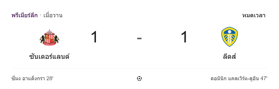 ส่วนลีดส์เก็บเพิ่มเป็น 20 คะแนนจาก 18 นัด อยู่ที่อันดับ 16 ชนะ 5 เสมอ 5 แพ้ 8 ประตูได้ 25 เสีย 32 ผลต่าง -7 ยังต้องเร่งเครื่องหนีโซนตกชั้น เพราะท้ายตารางทั้งฟอเรสต์ เวสต์แฮม และเบรนท์ฟอร์ดเริ่มดิ้นรนเก็บแต้มกันอย่างหนัก การบุกมาแบ่งแต้มจากทีมฟอร์มแรงอย่างซันเดอร์แลนด์ได้ จึงถือเป็นแต้มสำคัญในภารกิจอยู่รอดของยูงทอง