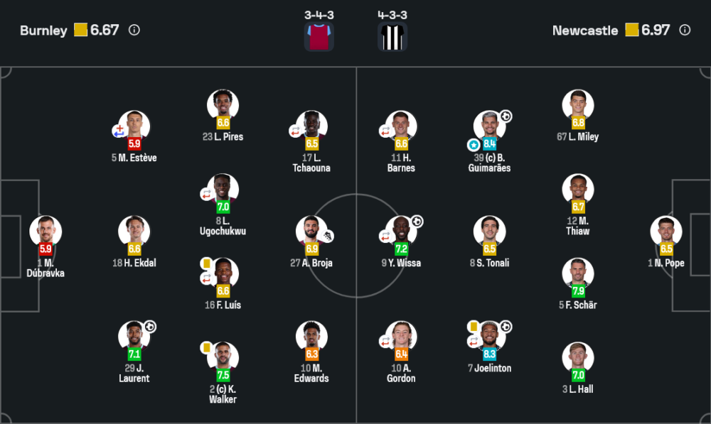 เอ๊ดดี้ ฮาว กดปุ่มปรับแท็กติก นาที 72 ส่ง เจค็อบ เมอร์ฟี่ ลงแทน ฮาร์วีย์ บาร์นส์ เพื่อเพิ่มสปีดสวนกลับ จากนั้นนาที 74 เบิร์นลี่ย์ตอบโต้ด้วยการสลับเอา ยาค็อบ บรืน ลาร์เซ่น ลงแทน ลามีน ชาอูนา หวังเพิ่มความจัดจ้านริมเส้น