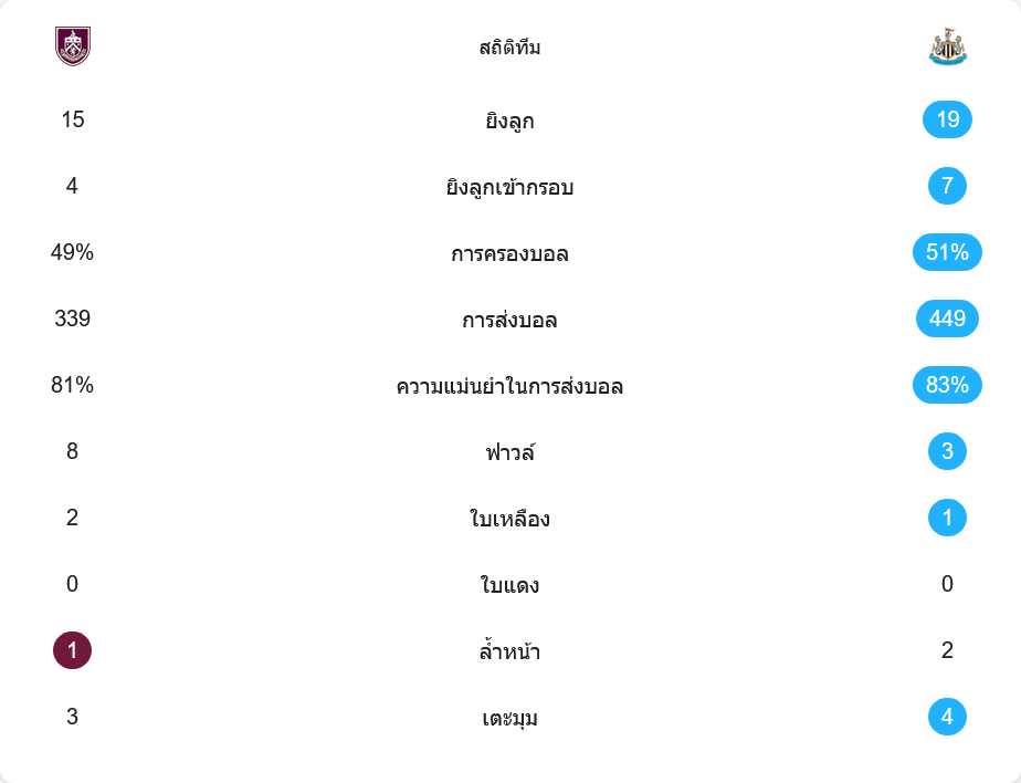 แม้เปอร์เซ็นต์การครองบอลจะใกล้เคียงกัน 49% ต่อ 51% แต่จำนวนการส่งบอลของนิวคาสเซิลอยู่ที่ 449 ครั้ง และมีความแม่นยำสูงถึง 83% สูงกว่าเจ้าบ้านที่ส่ง 339 ครั้ง แม่นยำ 81% เล็กน้อย ขณะที่เกมรับของเบิร์นลี่ย์ต้องทำฟาวล์ถึง 8 ครั้ง ได้ใบเหลือง 2 ใบ แสดงให้เห็นว่าพวกเขาต้องใช้การตัดเกมหนัก ๆ เพื่อหยุดจังหวะสวนกลับของทีมเยือน ส่วนลูกตั้งเตะอย่างเตะมุม นิวคาสเซิลได้มากกว่า 4 ครั้งต่อ 3 ซึ่งช่วยให้พวกเขาขึงเกมรุกตามแบบฉบับทีมที่คุมจังหวะเกมได้เหนือกว่า