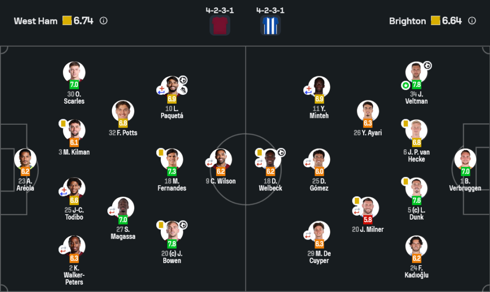 ฝั่งเวสต์แฮมต้องยกให้ โบเว่น กับ แฟร์นานเดส ที่เรตติ้งสูงสุดในทีม ขณะที่ไบรท์ตันมี เวลท์มัน, ดังค์ และ แฟร์บรูกเก้น ที่ยืนระยะเล่นดีตลอด 90 นาที ช่วยให้ทีมเยือนบุกแบ่งแต้มได้สำเร็จ