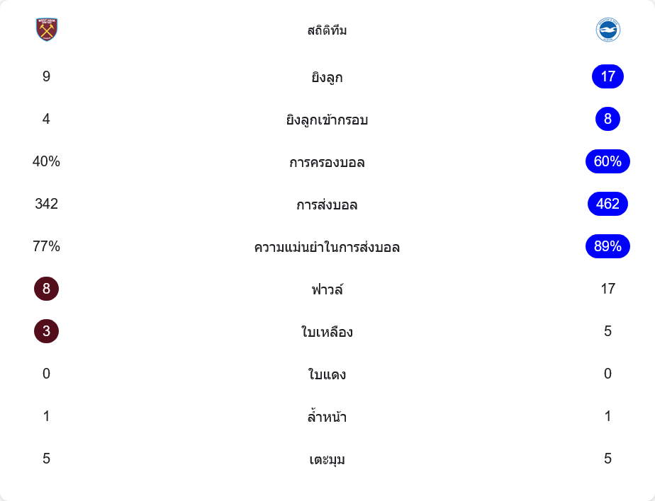 ตัวเลขหลังเกมสะท้อนชัดว่าไบรท์ตันคุมจังหวะได้เหนือกว่า เวสต์แฮมยิงทั้งหมด 9 ครั้ง เข้าเป้า 4 ลูก ขณะที่ทีมเยือนกดไปถึง 17 ครั้ง เข้ากรอบ 8 ครั้ง การครองบอลก็ชัดเจน เวสต์แฮมมีแค่ 40% ต้องวิ่งไล่บอลอยู่เกือบตลอด ส่วนไบรท์ตันครองบอล 60% ต่อบอลลื่น ๆ ถึง 462 ครั้ง เทียบกับเจ้าถิ่นที่ทำได้ 342 ครั้งเท่านั้น ความแม่นยำในการส่งบอลไบรท์ตันแตะระดับ 89% ส่วนเวสต์แฮมอยู่ที่ 77% สถิติเกมรับก็เห็นได้ว่าทีมเยือนบดหนัก แท็กเกิลและตัดฟาวล์เยอะกว่า ทำให้ยอดฟาวล์ของไบรท์ตันพุ่งไปถึง 17 ครั้ง ขณะที่เวสต์แฮมทำฟาวล์ 8 ครั้ง ใบเหลืองออกมา 3 ใบให้เจ้าบ้าน และ 5 ใบให้ทีมเยือน สุดท้ายจำนวนเตะมุมเท่ากันที่ 5-5 แสดงให้เห็นว่าเกมรุกทั้งสองฝั่งสร้างโอกาสต่อเนื่อง แต่จังหวะสุดท้ายขาดคมกันไปคนละด้าน