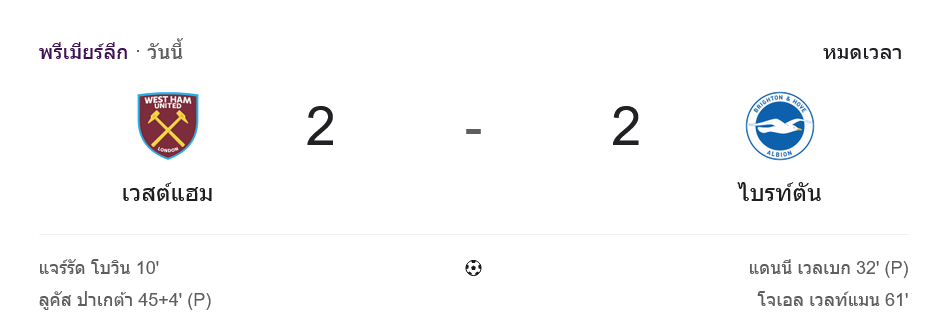 จาก : ผลบอลสด พรีเมียร์ลีก ระหว่าง เวสต์แฮมยูไนเต็ด 2-2 ไบรท์ตัน โฮฟ อัลเบี้ยน วันนี้ 31/12/68 – บ้านกีฬา