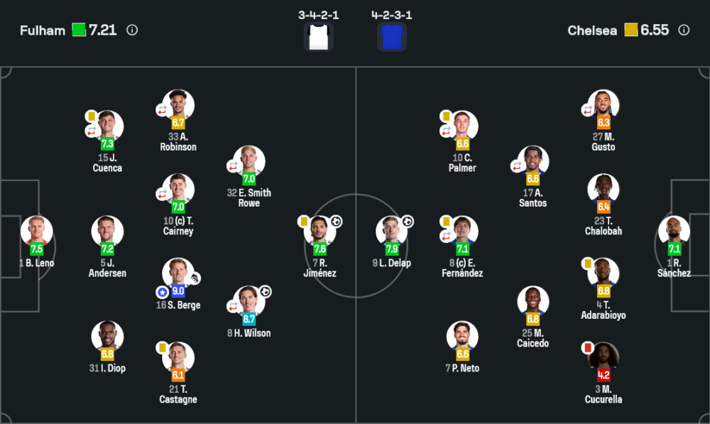 ด้านเชลซีใช้ 4-2-3-1 ที่ถูกบังคับให้ปรับเป็น 4-4-1 หลังเสียกูกูเรย่า ใบแดงทำให้แนวรุกต้องยอมถอย เน้นตั้งบล็อกลึกและรอจังหวะสวนกลับ เดลาปยืนค้ำไว้คนเดียวโดยมีเนโต้กับพาลเมอร์คอยวิ่งโต้กลับ แต่เมื่อเหลือ 10 คนการไล่เพรสด้านบนแทบทำไม่ได้ จึงปล่อยให้ฟูแล่มถ่ายบอลกินพื้นที่อยู่เรื่อยๆ กระทั่งโดนสองประตูในครึ่งหลัง แม้จะยังอันตรายเวลาหลุดขึ้นมาบุก แต่เกมรับที่ต้องเล่นด้วยกำลังคนที่น้อยกว่าก็รับมือกับการบุกเป็นคลื่นของเจ้าบ้านไม่ไหว