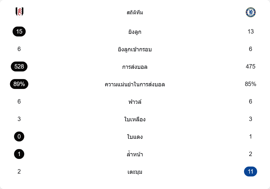ตัวเลขหลังเกมบอกชัดว่าฟูแล่มคุมจังหวะอยู่หมัด เจ้าถิ่นยิงทั้งหมด 15 ครั้ง เข้ากรอบ 6 ครั้ง ส่วนเชลซียิง 13 ครั้ง เข้ากรอบ 6 ครั้งเท่ากัน แต่ความเฉียบคมในจังหวะสุดท้ายและการจัดการเกมหลังได้เปรียบตัวผู้เล่นทำให้ฟูแล่มเปลี่ยนโอกาสเป็นประตูได้มากกว่า ในแง่การครองบอล ฝั่งเจ้าบ้านต่อบอลจนครบ 528 ครั้ง อัตราความแม่นยำ 89% เหนือกว่าเชลซีที่ส่งบอล 475 ครั้ง ความแม่นยำ 85% ทั้งสองทีมทำฟาวล์เท่ากัน 6 ครั้ง ใบเหลืองฝั่งละ 3 ใบ ทว่าความแตกต่างคือใบแดงของกูกูเรย่า ส่วนลูกตั้งเตะมุม เชลซีได้ถึง 11 ครั้ง มากกว่าฟูแล่มที่มีเพียง 2 ครั้ง สะท้อนว่าแม้จะเล่นน้อยคนแต่ทีมเยือนยังคงอันตรายจากบอลเซตเพลย์ ทว่าก็ไม่สามารถเปลี่ยนให้เป็นแต้มได้ในท้ายที่สุด