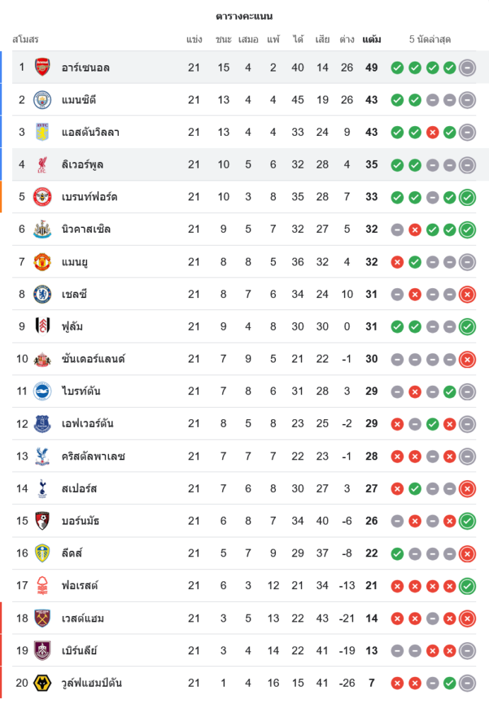📊 สถานการณ์ในตารางคะแนนพรีเมียร์ลีก อังกฤษ