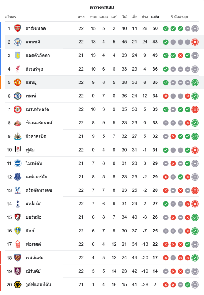 ชัยชนะนัดนี้ทำให้แมนเชสเตอร์ ยูไนเต็ดขยับขึ้นมารั้งอันดับ 5 ของตาราง มี 35 แต้มจาก 22 นัด ตามหลังลิเวอร์พูลทีมอันดับ 4 แค่แต้มเดียว และยังมีโอกาสไล่จี้กลุ่มท็อปโฟร์เต็มตัว ส่วนแมนเชสเตอร์ ซิตี้หยุดนิ่งอยู่ที่ 43 คะแนน ตามหลังจ่าฝูงอาร์เซนอล 7 แต้ม และมีแต้มเท่ากับแอสตัน วิลลา ทำให้แรงกดดันในโค้งต่อไปของพรีเมียร์ลีกเพิ่มขึ้นแบบมหาศาล ใครเปิดดู ตารางบอล ตอนนี้จะเห็นชัดว่าฤดูกาลนี้ยังอีกยาวและพื้นที่แชมเปียนส์ลีกพร้อมจะสลับมือได้ทุกสัปดาห์