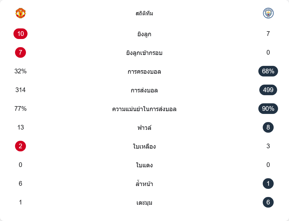เบื้องหน้าดูเหมือนซิตี้เล่นดีกว่าเพราะครองบอลถึง 68 เปอร์เซ็นต์ ส่งบอล 499 ครั้งด้วยความแม่นยำ 90 เปอร์เซ็นต์ ขณะที่ยูไนเต็ดมีเพียง 32 เปอร์เซ็นต์และผ่านบอล 314 ครั้ง ความแม่นยำ 77 เปอร์เซ็นต์ แต่เมื่อลงลึกในรายละเอียดจะเห็นว่าเจ้าบ้านสร้างโอกาสจะแจ้งมากกว่าอย่างชัดเจน พวกเขายิงทั้งหมด 10 ครั้ง เข้ากรอบถึง 7 ครั้ง และเปลี่ยนเป็น 2 ประตูเต็มเม็ดเต็มหน่วย ตรงข้ามกับซิตี้ที่ยิง 7 ครั้งแต่ไม่มีลูกไหนเข้ากรอบเลยแม้แต่ลูกเดียว สถิติใบเหลืองยูไนเต็ด 2 ใบ ซิตี้ 3 ใบ บ่งบอกถึงความดุเดือดของดาร์บีนี้ ส่วนเตะมุมซิตี้เหนือกว่าชัด 6-1 ทว่ามันกลับไม่เคยเปลี่ยนเป็นภัยคุกคามจริง ๆ ต่อประตูของลัมเมนส์