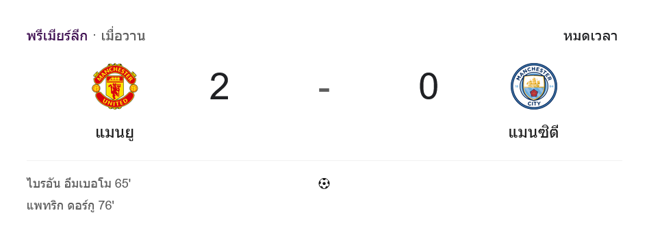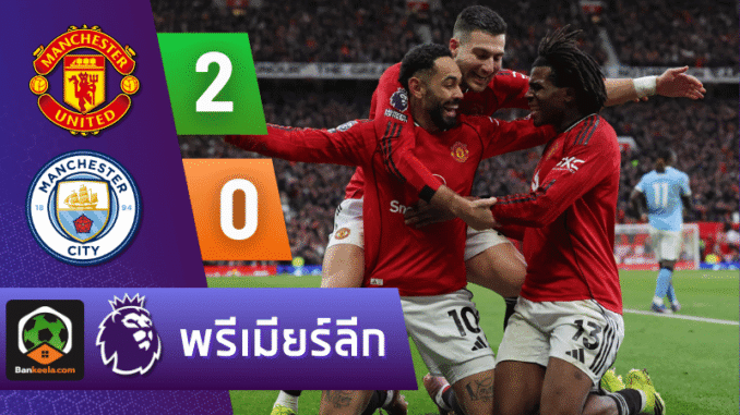 ศึกพรีเมียร์ลีก อังกฤษ ที่โอลด์ แทรฟฟอร์ด ดาร์บีแมตช์แห่งเมืองแมนเชสเตอร์จบลงด้วยชัยชนะสุดเดือดของแมนเชสเตอร์ ยูไนเต็ด เมื่อบ้านเปิดถ้ำผีอัดอริร่วมเมือง แมนเชสเตอร์ ซิตี้ 2-0 ไบรอัน เอ็มเบโม่ กับ แพทริค ดอร์กู สังหารคนละเม็ด ขณะที่ บรูโน แฟร์นันด์ส คุมจังหวะเกมเหมือนวาทยกร ทำให้เสียงเชียร์ในโรงละครแห่งความฝันดังสะเทือนตาม ผลบอลสด ตลอด 90 นาที