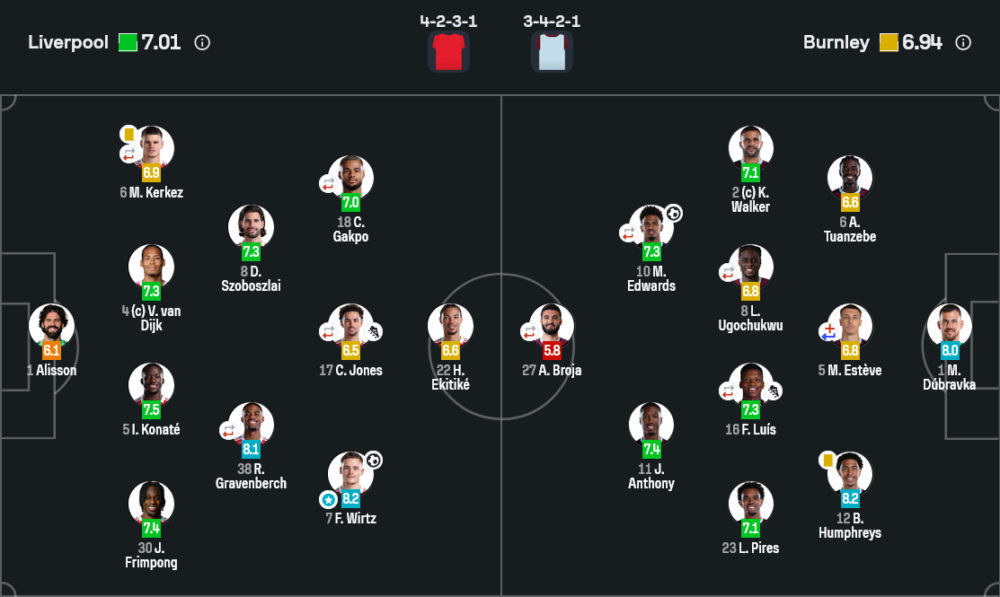แม้ลิเวอร์พูลจะไม่ชนะ แต่รางวัลแข้งยอดเยี่ยมของเกมต้องยกให้ ฟลอเรียน เวียร์ตซ์ เพลย์เมกเกอร์ดาวรุ่งที่กวาดคะแนนสูงสุด 8.2 เขาไม่เพียงยิงประตูขึ้นนำให้ทีม แต่ยังเป็นศูนย์กลางเกมรุกที่สร้างสรรค์โอกาสต่อเนื่อง ลากหลอกแนวรับเบิร์นลีย์ได้ตลอด 90 นาที การหาพื้นที่ระหว่างไลน์กองกลางกับกองหลังคู่แข่งทำให้แนวรับทีมเยือนต้องเหนื่อยกับการไล่ปิดทุกจังหวะ