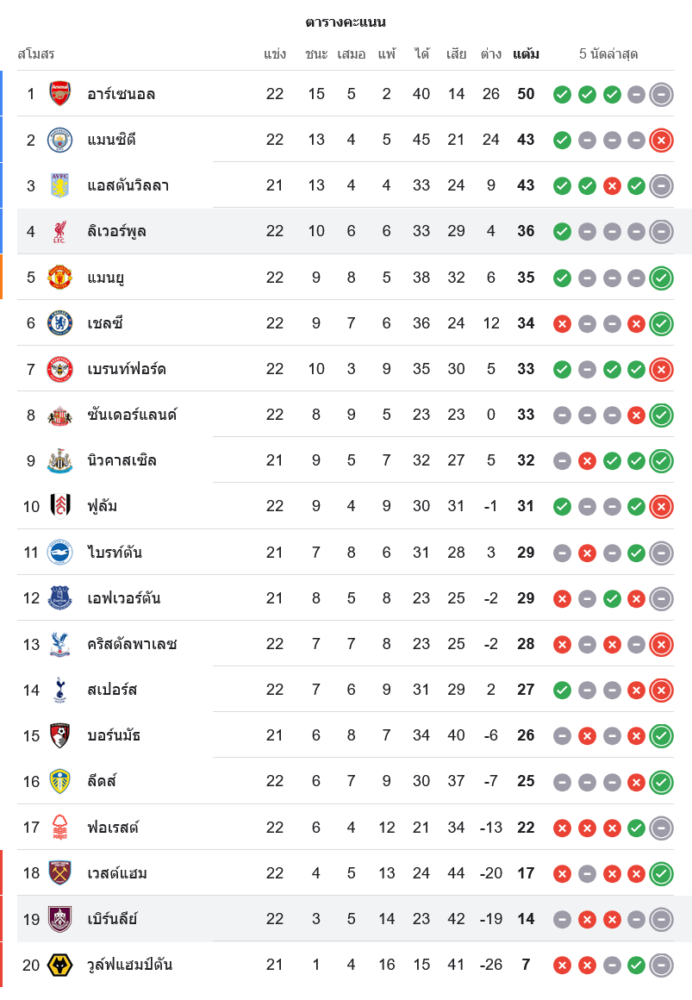 📌 สถานการณ์บนตารางคะแนนพรีเมียร์ลีก