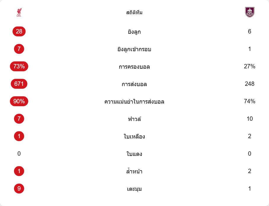 ตัวเลขหลังเกมบอกเรื่องราวชัดเจน ลิเวอร์พูลครองบอลสูงถึง 73% ต่อ 27% ของเบิร์นลีย์ จ่ายบอล 671 ครั้ง ความแม่นยำทะลุ 90% ขณะที่ทีมเยือนจ่ายได้เพียง 248 ครั้ง แม่นยำ 74% เท่านั้น เจ้าถิ่นกดดันด้วยการยิงทั้งหมด 28 ครั้ง เข้ากรอบ 7 ครั้ง ส่วนเบิร์นลีย์ยิงเพียง 6 ครั้ง เข้ากรอบ 1 ครั้ง และลูกนั้นคือประตูตีเสมอของเอ็ดเวิร์ดส์