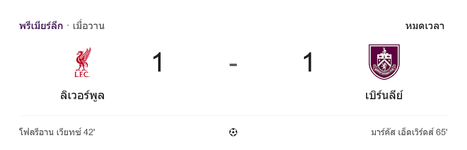 ช่วงทดเจ็บ เบิร์นลีย์เน้นถ่วงเวลา แอชลีย์ บาร์นส์ โดนใบเหลืองจากการเสียเวลา นาที 91 ตามด้วย บาชีร์ ฮัมฟรีส์ โดนอีกใบในนาที 92 จากการฟาวล์ตัดเกม แต่สุดท้าย ลิเวอร์พูล ก็ทุบกำแพงทีมเยือนไม่แตก จบเกมเสมอ 1-1 ชนิดแฟนหงส์เซ็งทั้งแอนฟิลด์