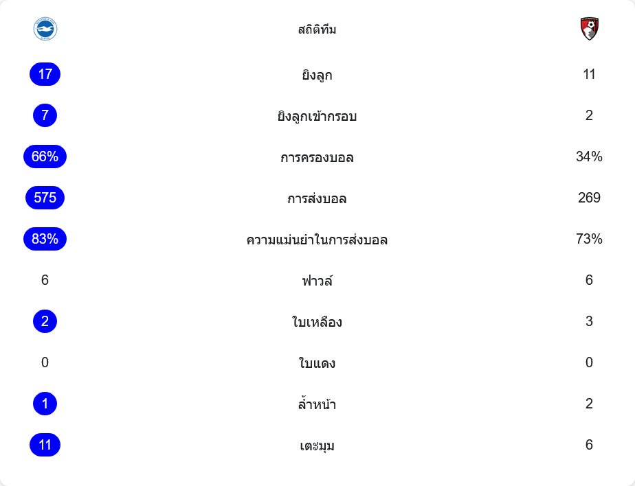 ตัวเลขสถิติยืนยันชัดว่าไบรท์ตันเป็นฝ่ายคุมเกมตลอด 90 นาทีเต็ม เจ้าถิ่นยิงทั้งหมด 17 ครั้ง เข้ากรอบ 7 ครั้ง ขณะที่บอร์นมัธยิงเพียง 11 ครั้ง เข้ากรอบแค่ 2 หนเท่านั้น แม้ทีมเยือนจะประตูนำก่อน แต่ความอันตรายในเชิงปริมาณและคุณภาพโอกาสอยู่ฝั่งเจ้าบ้านมากกว่า