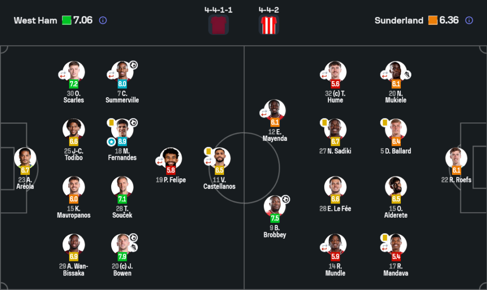 ด้านซันเดอร์แลนด์ ระบบ 4-4-2 ของเลอ บริส์ช่วงครึ่งแรกเหมือนถูกตัดไฟตั้งแต่ต้นลาน บร็อบบี กับ มายเยนดา แทบไม่ได้สัมผัสบอลในพื้นที่สุดท้าย เพราะปีกทั้งสองฝั่งถูกกดยืนต่ำ ขณะที่คู่กลางไม่สามารถทะลุเพรสของเวสต์แฮมได้เลย ครึ่งหลังเมื่อเปลี่ยนตัวสามคนรวด ทีมเยือนเริ่มขยับไลน์ขึ้นสูง ใช้การต่อบอลสั้นผสมยาวจี้ใส่แนวรับเจ้าถิ่น และการให้มูกีเลเติมสูงคือจุดเปลี่ยนที่พาทีมได้ประตูตีไข่แตก
