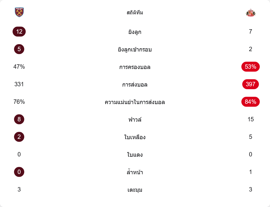 ด้านเกมปะทะ ซันเดอร์แลนด์ทำฟาวล์ถึง 15 ครั้ง มากกว่าเวสต์แฮมที่ทำเพียง 8 ครั้ง และจบเกมด้วยใบเหลืองถึง 5 ใบ ชัดเจนว่าต้องไล่หยุดจังหวะโต้กลับของเจ้าบ้านตลอด ส่วนลูกเตะมุมเท่ากัน 3 ต่อ 3 แสดงให้เห็นว่าทั้งสองทีมต่างก็มีช่วงกดดันกันเอง แต่เวสต์แฮมคมกว่าเมื่อต้องเปลี่ยนโอกาสให้เป็นประตู